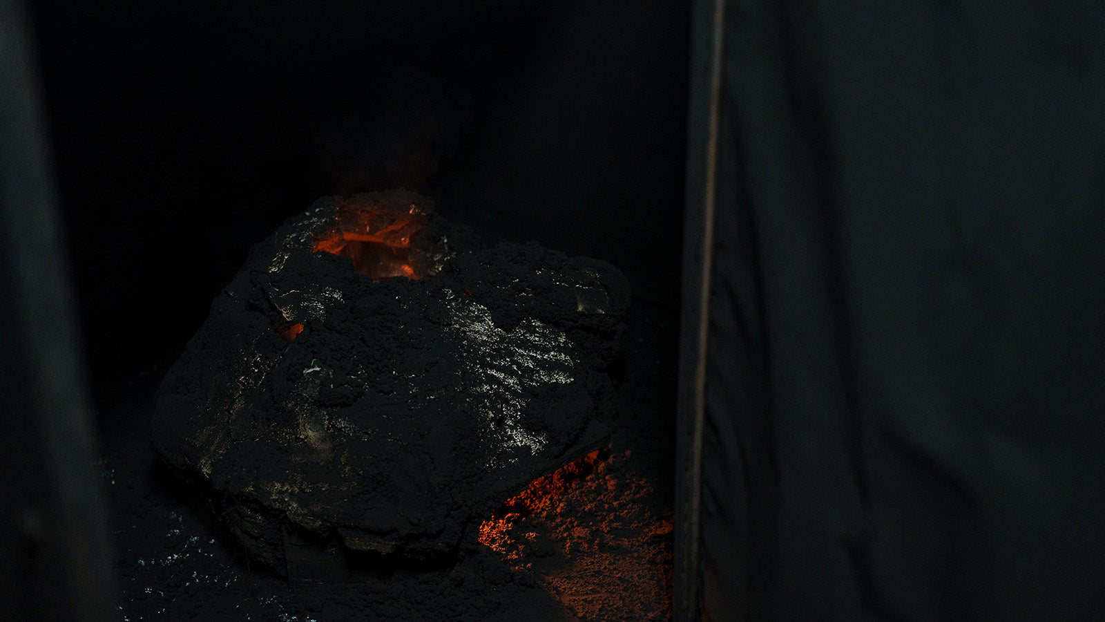 small pieces of pine wood are burned slowly, one by one, for 100 hours.